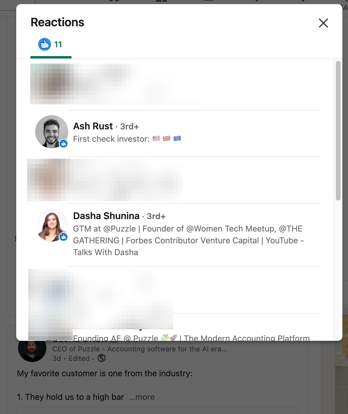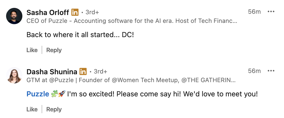 Comment from Dasha Shunina (Forbes contributor, founder of Women Tech Meetup, Puzzle’s GTM strategist): “Puzzle 🧩🚀 I’m so excited! Please come say hi! We’d love to meet you!” The comment received initial engagement from Women Tech Meetup and THE GATHERING accounts, as with all Puzzle posts.
