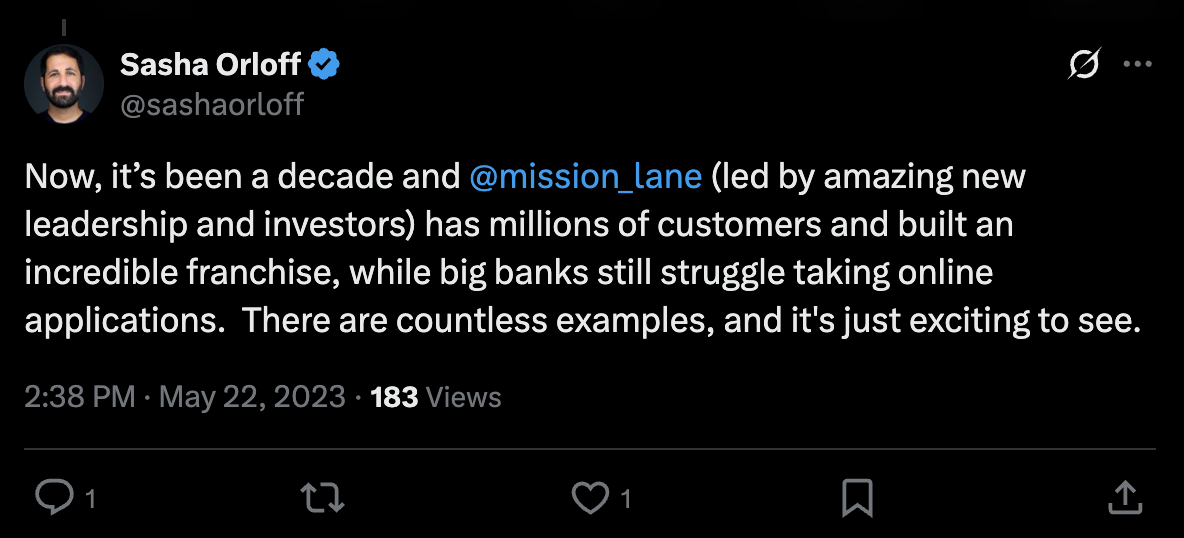 | +---> Also invested: Credit Karma, Mission Lane