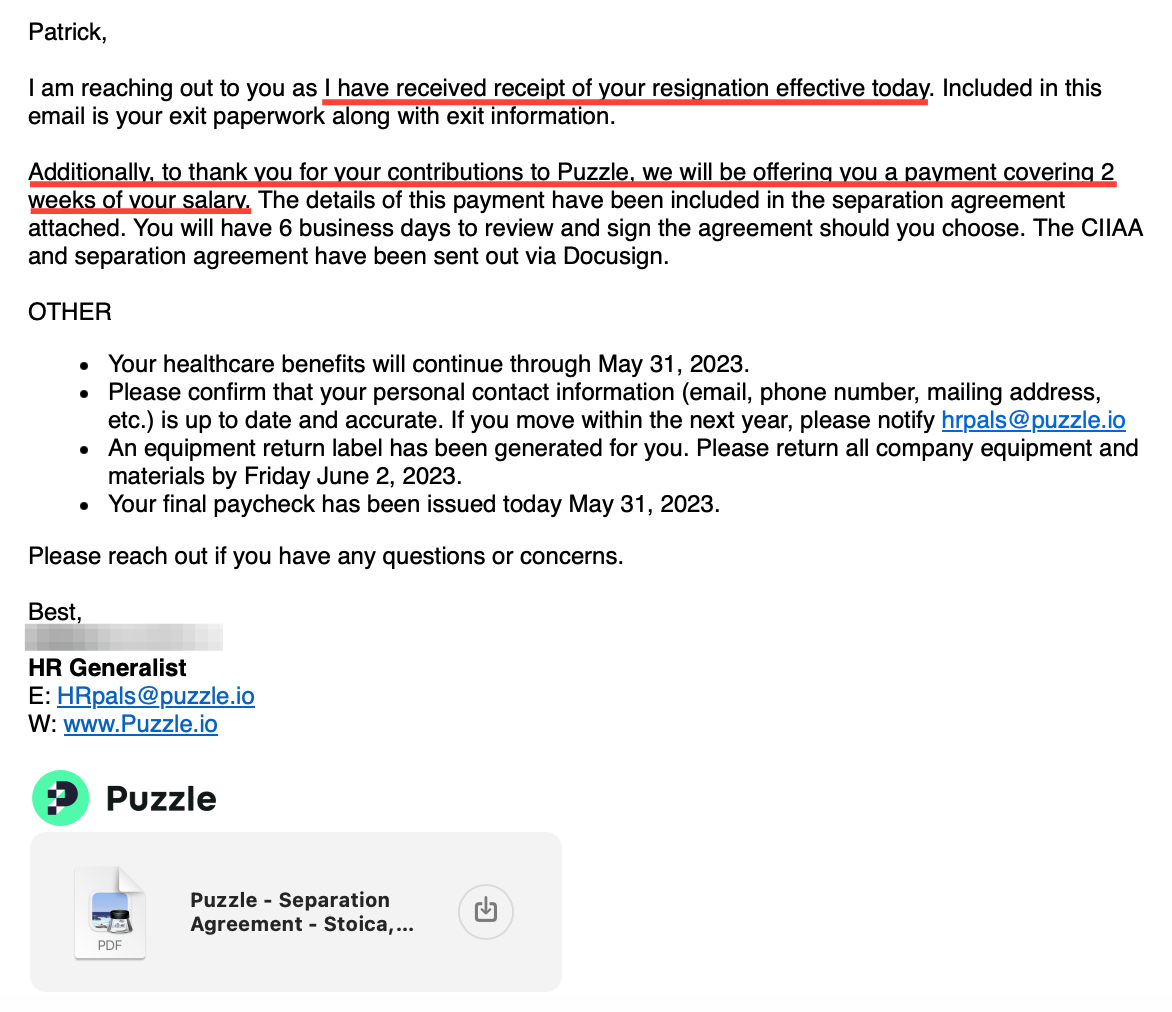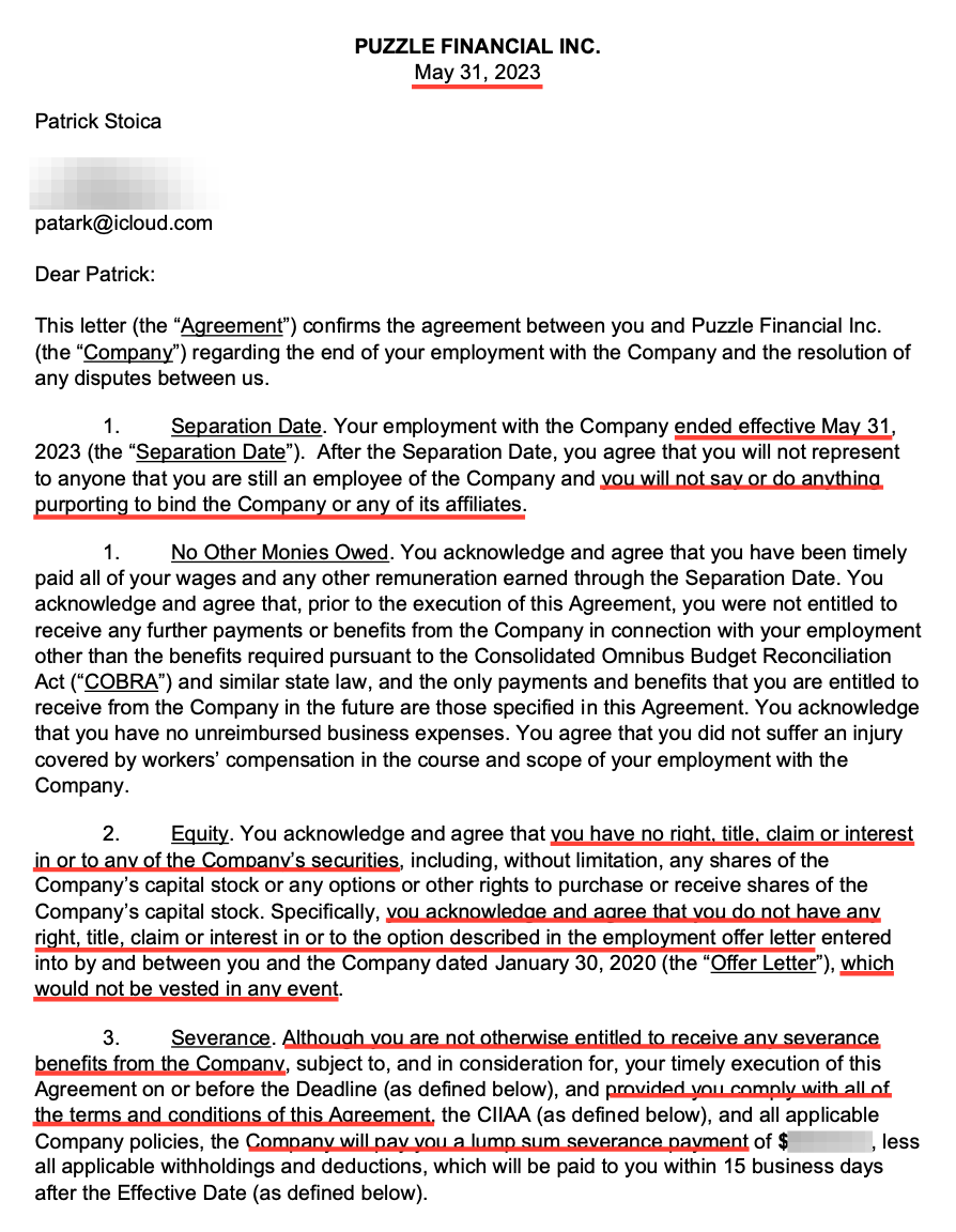 “In exchange for two weeks’ severance, they required me to waive claims against not just Puzzle, but ‘its predecessors, successors, past, present or future subsidiaries, affiliated companies, investors, branches or related entities‘“