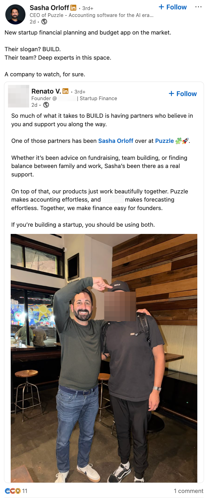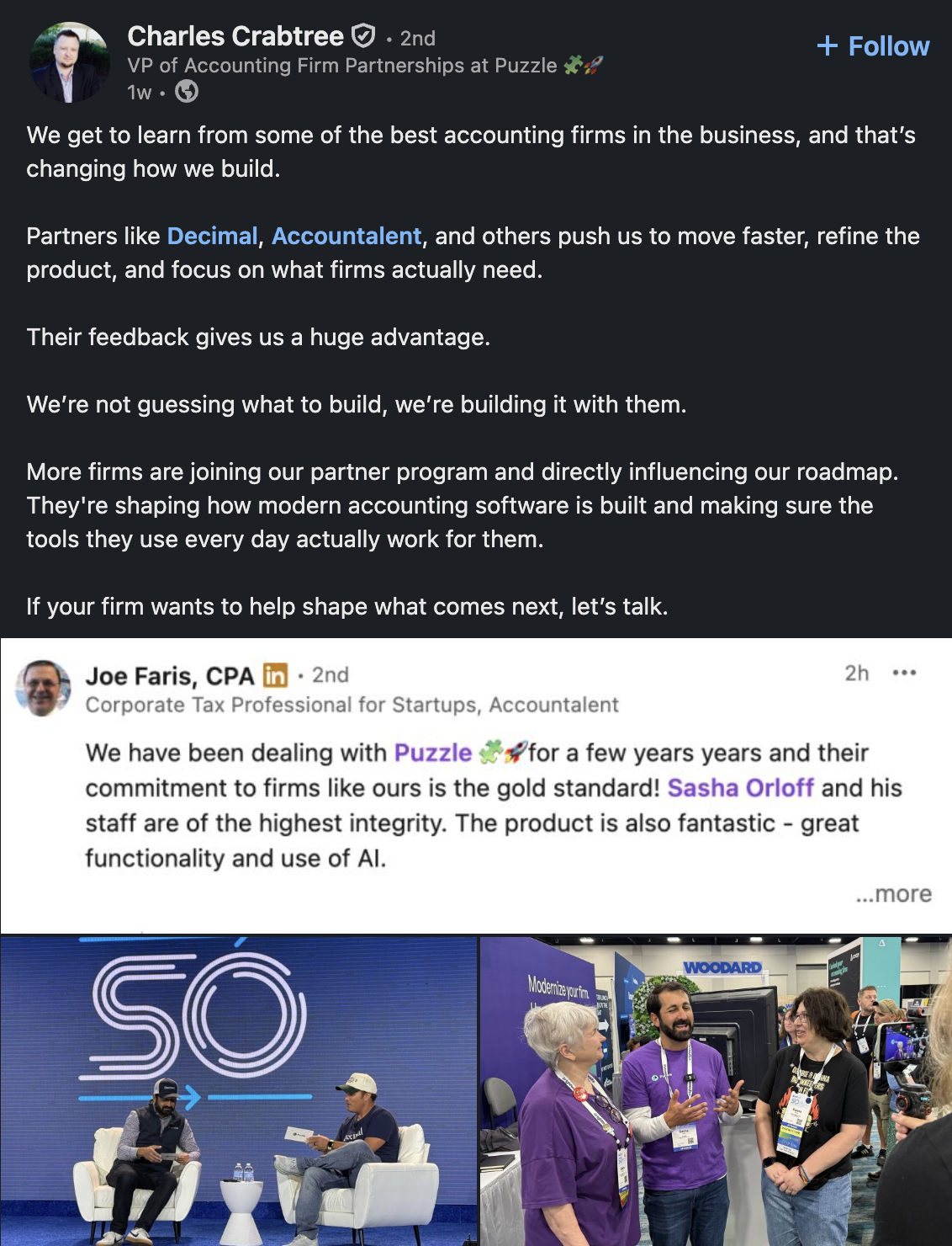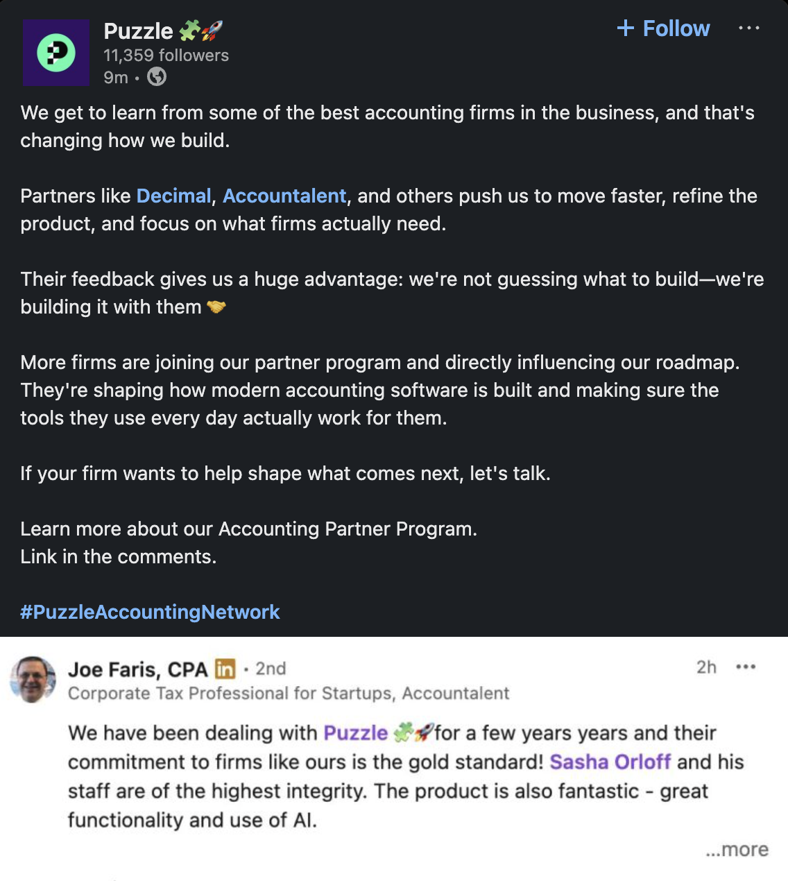 November 4, 2025 (approximately, posted “1w” as of Nov 12): Charles Crabtree, VP of Accounting Firm Partnerships at Puzzle Financial, shared testimonial from Joe Faris, CPA (Corporate Tax Professional for Startups, Accountalent) stating: “We have been dealing with Puzzle 🧩🚀 for a few years and their commitment to firms like ours is the gold standard! Sasha Orloff and his staff are of the highest integrity.”