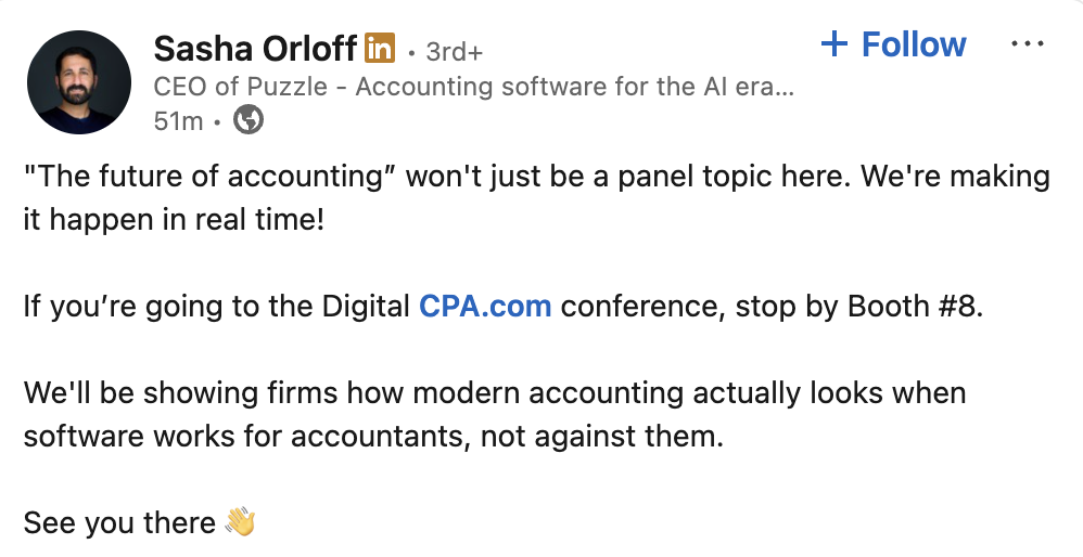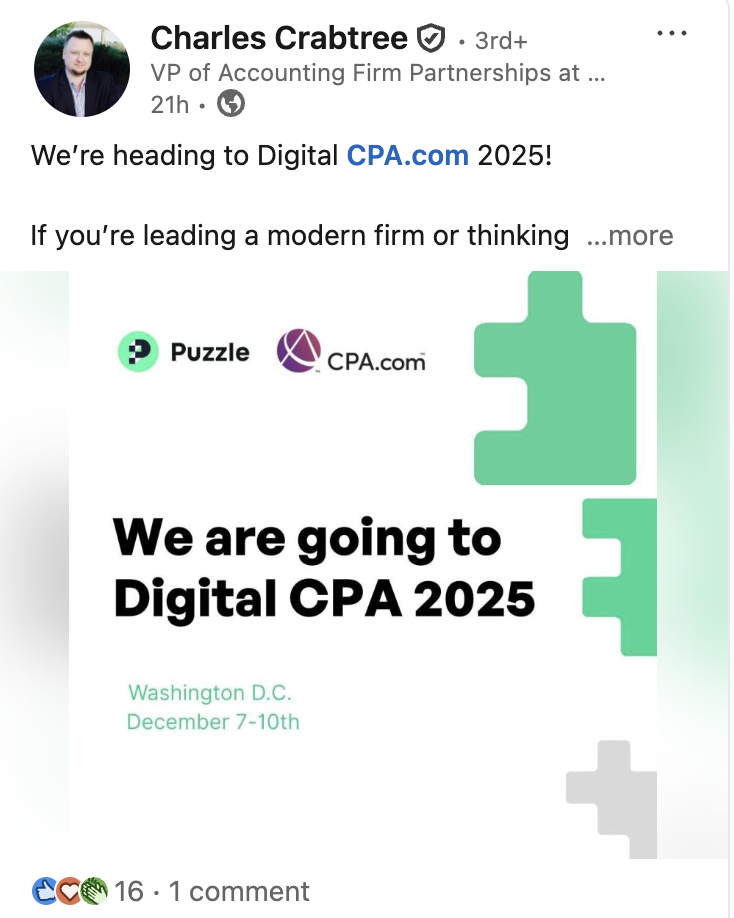 November 10, 2025: Puzzle announced CPA.com partnership for Digital CPA Conference 2025 (December 7-10, Washington DC, Booth #8). The LinkedIn post stated “Swing by Booth #8 to meet our team and see a live product demo.”