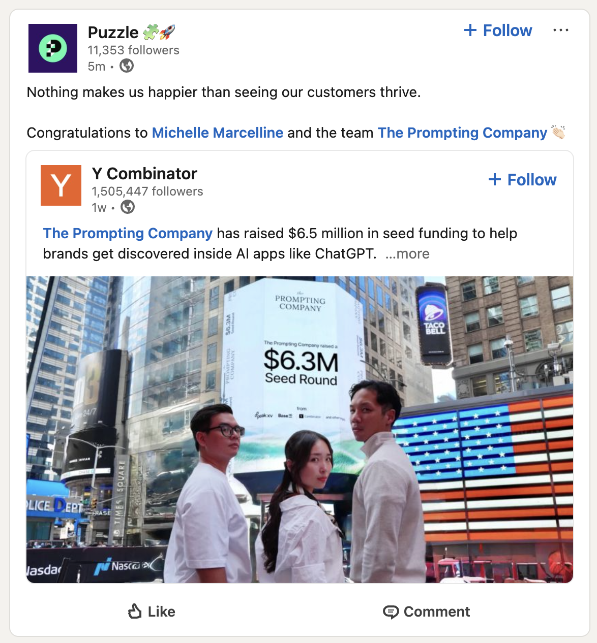 Days after publication of complete fraud documentation (with continual updates and warnings), Puzzle reposted Y Combinator’s celebration of customer The Prompting Company’s $6.5M seed round. The post stated “Nothing makes us happier than seeing our customers thrive” - using YC’s 1.5M follower platform for customer acquisition and legitimacy positioning.