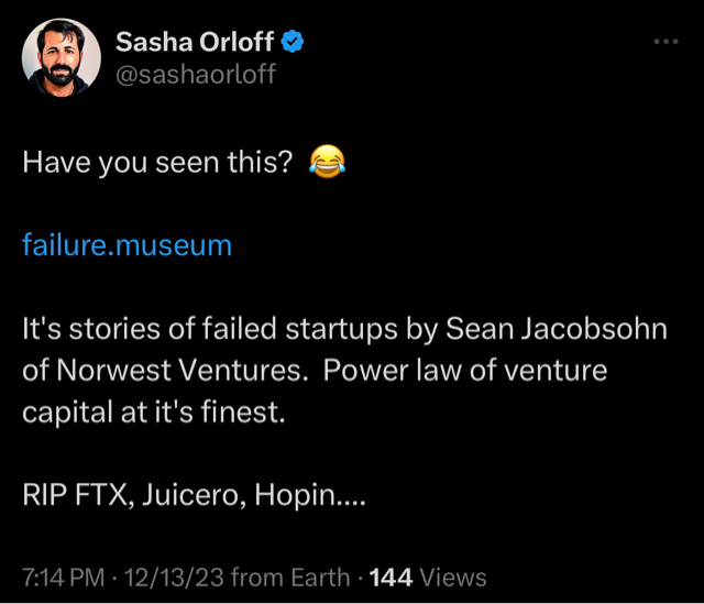 December 13, 2023: Six months after my termination, CEO shared “failure.museum” - a site documenting failed startups - with laughing emoji, commenting “Power law of venture capital at it’s finest. RIP FTX, Juicero, Hopin…” This was posted while LendUp (CFPB shutdown, 140,000+ victims, $0 to shareholders) was conspicuously absent from his reflection on startup failures. I forwarded this post to [email protected] in December 2023, adding to the documentation already provided to senior reporter Connie Loizos in August 2023. The performative contempt for regulatory accountability came while operating accounting software trusted for financial reporting and tax preparation.